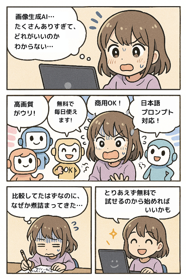 AI画像生成ツールには、幅広い用途に対応した一般的なタイプのものに加えて、特定の目的や作風に特化したものも多く登場しています。自分のニーズに合ったツールを選ぶことで、より理想に近い画像を効率的に生成することが可能になります。